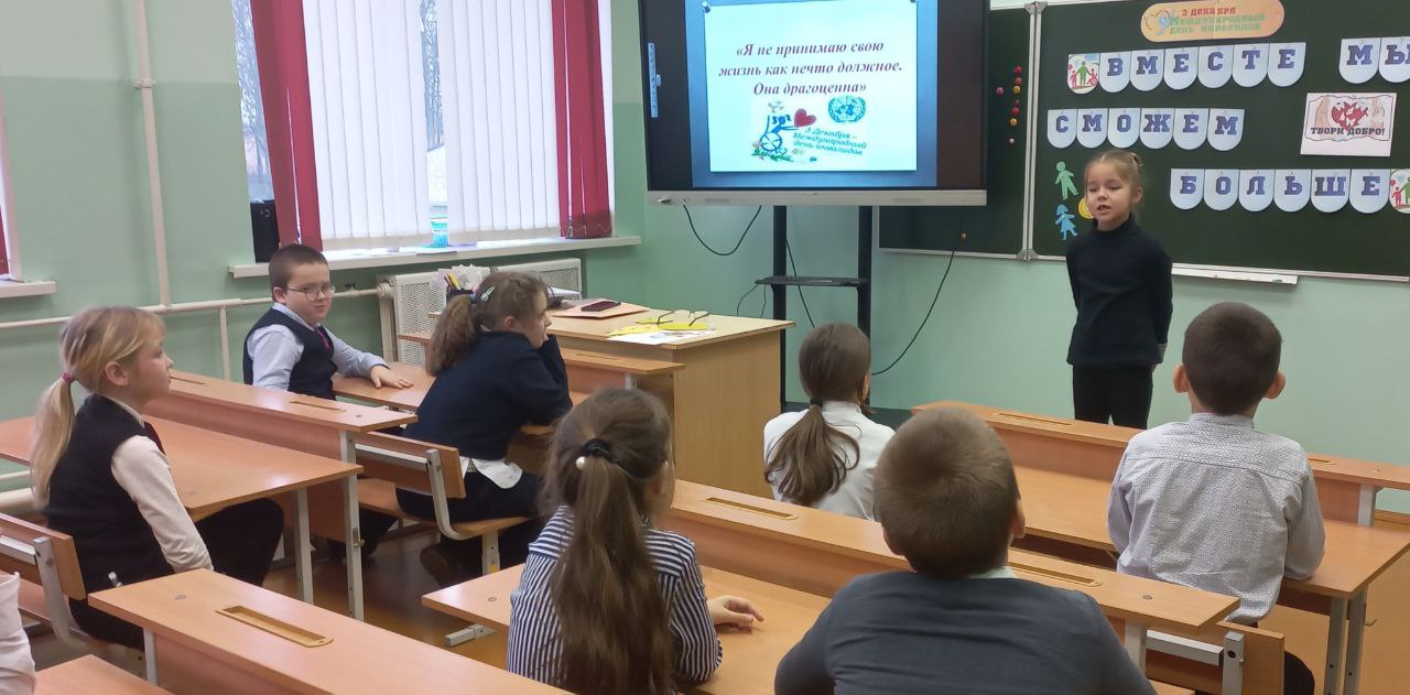 2 декабря в 6 классе прошёл Единый урок Добра "Добротой измерь свой путь", посвящённый Международному Дню инвалидов. Учащиеся познакомились с биографиями Героев Советского Союза, которые были тяжело ранены. Некоторые из них потеряли руки и ноги во имя спасения других людей, проявили мужество и храбрость. Несомненно, эти герои являются примером стойкости и веры в Победу. Учащиеся убедились на примерах спортсменов Паралимпийских игр, что люди с инвалидностью могут добиваться успехов благодаря своим личностным качествам.