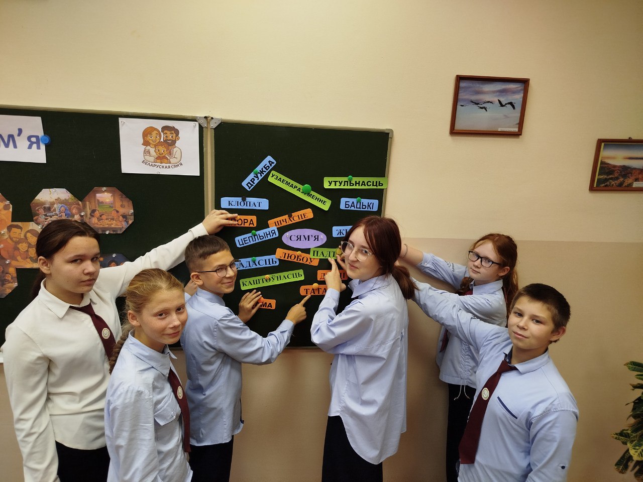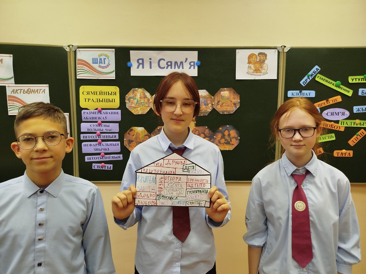 27 лістапада ў 7 класе ў рамках інфармацыйна - адукацыйнага праекта "ШАГ" прайшла гадзіна зносін "Традыцыі маёй сям'і", падчас якой навучэнцы разважалі аб каштоўнасцях сям'і, расказвалі аб традыцыях сваёй сям'і. Сямікласнікі выказвалі свае меркаванні аб функцыях сям'і, яе значэнні ў жыцці кожнага чалавека. Вучні збіралі "рассыпаныя" прыказкі пра сям'ю, тлумачылі іх сэнс, а таксама з цэглаў- каштоўнасцей "будавалі" дом шчаслівай сям'і. Сямікласнікі аднагалосна пагадзіліся з вялікім кітайскім філосафам Канфуцыем, які пісаў: "Дзяржава - гэта вялікая сям'я, а сям'я - гэта маленькая дзяржава".