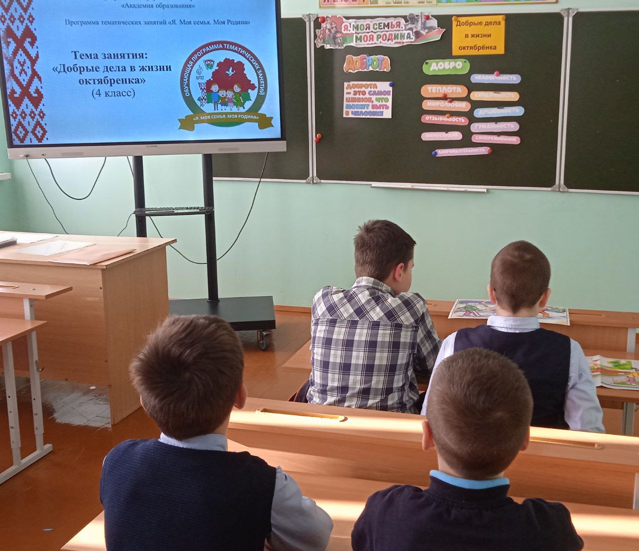 С целью формирования понимания значения слов "добро", "доброта", "доброжелательность", умения видеть их проявления в окружающих людях и их поступках, воспитания доброго и уважительного отношения к окружающим людям, мотивирования учащихся на совершение добрых дел во благо других людей, соблюдения октябрятских традиций 20 декабря в 4 классе Мижевичской средней школы" в рамках программы "Я. Моя семья. Моя Родина" прошёл классный час по теме "Добрые дела в жизни октябренка".