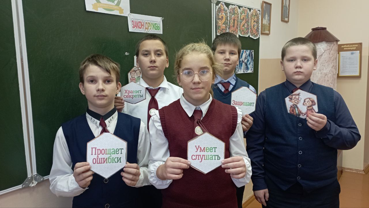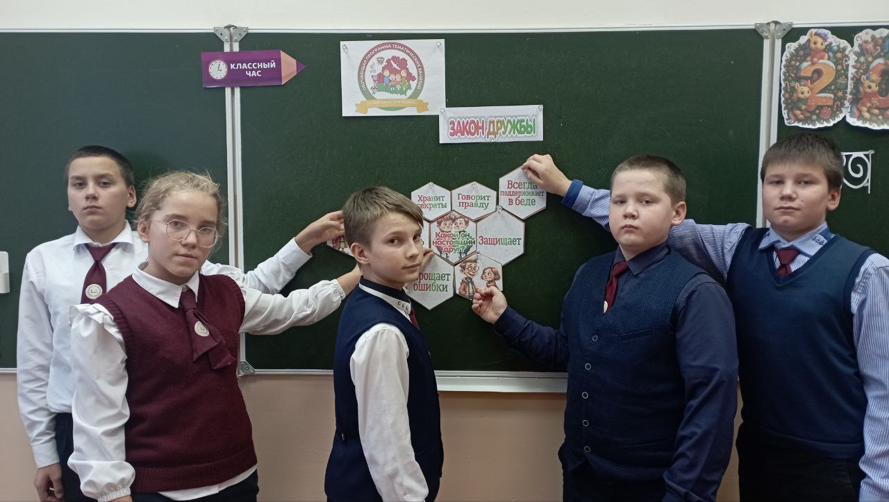 В 6 классе вс рамках реализации программы "Я. Моя Семья. Моя Родина" 16 декабря прошёл классный час "Закон Дружбы". Учащиеся рассуждали, что такое дружба, каким должен быть настоящий друг, какие есть законы дружбы и как избегать конфликтов. Подводя итог мероприятия, ребята пришли к выводу, что очень важно беречь дружбу, потому что без неё жить очень трудно.