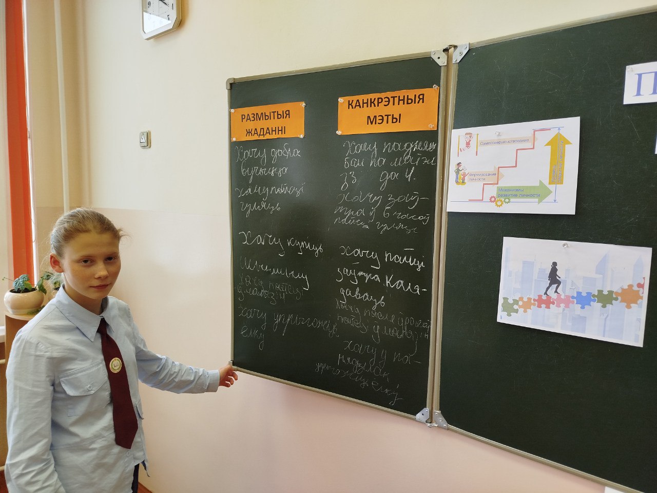 У 7 класе ў рамках заняткаў “Мой псіхалагічны дабрабыт" прайшла класная гадзіна па тэме: "Я – у дзеянні: стратэгіі асобістага росту". Мэтай мерапрыемства стала фарміраванне навыкаў вызначэння мэт, уменне ставіць перад сабой кароткатэрміновыя, перспектыўныя мэты і дасягаць іх. Падчас класнай гадзіны сямікласнікі разважалі аб тым, як ператвараць мары ў рэальныя планы, як станавіцца лепшымі і больш упэўненымі. Выканаўшы практыкаванне "Да рысы", навучэнцы выказвалі сваё меркаванне: важнымі на шляху да мэты з'яўляюцца смеласць ісці да канца або асцярожнасць. Вынікам мерапрыемства стала выснова аб тым, што вялікая мэта пачынаецца з маленькага кроку і простага плана, што мяняцца і спрабаваць – гэта нармальна, што асабісты рост – гэта не пра тое, каб быць ідэальным, а пра рух наперад, пра цікавасць да жыцця і да самога сабе.